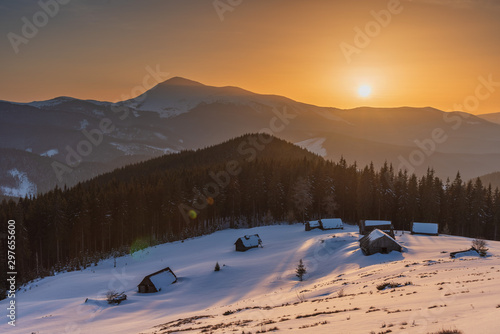 Beautiful winter landscapes from the Ukrainian Carpathian Mountains with traumatic skies and tourists, traveling on ridges