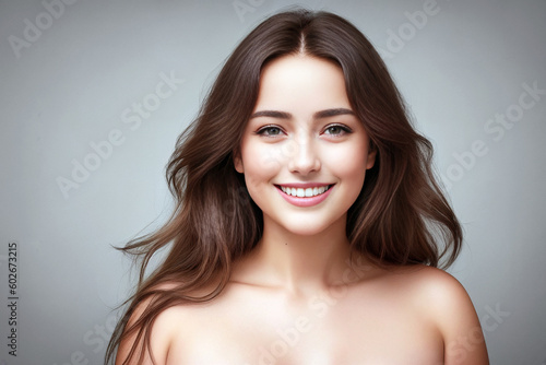 Beautiful woman brunette beauty close-up portrait on gray background. Generative AI