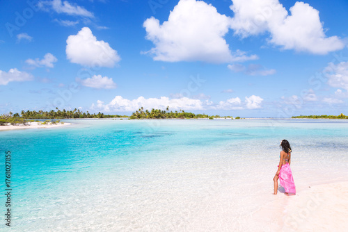 Beautiful woman in the blue lagoon, Tikehau, French Polynesia