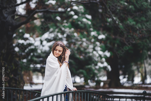 beautiful woman in white shawl with crown in park