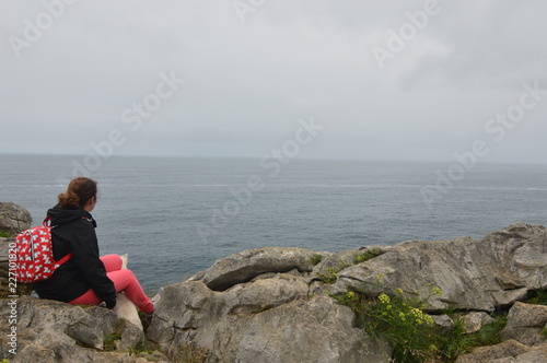 Beautiful Woman Looks At The Infinity Of The Cantabrian Sea From The Top Of Gulpiyuri Beach In The Council Of Llanes. Nature, Travel, Landscapes, Beaches. July 31, 2018. Llanes, Asturias, Spain.