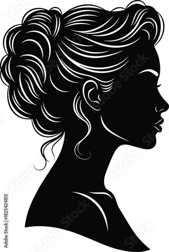 Beautiful woman profile silhouette vector with detailed wavy hair bun, isolated on white background, perfect for hair salon logo, beauty spa, and fashion illustration.