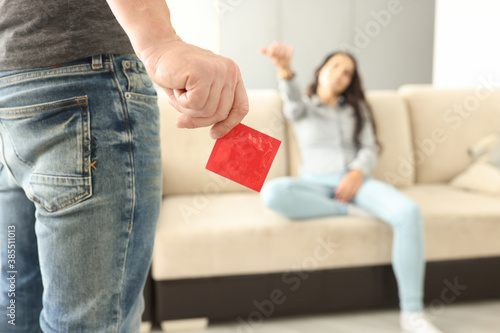 Beautiful woman sit on sofa in room and call man to her. Male hand hold red condom.