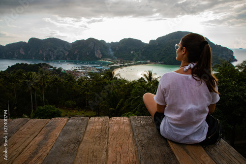 Beautiful woman sitting on wooden platform with Phi Phi island views and cloudy sky