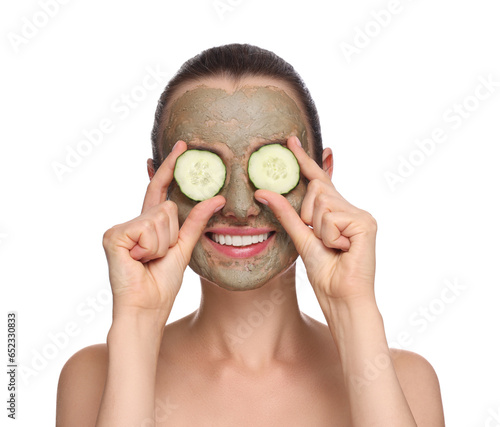 Beautiful woman with clay mask covering eyes with pieces of cucumber on white background