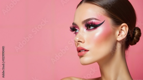 Beautiful Woman with Pink Makeup and Black Eyeliner