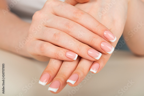 Beautiful woman's hands with beautiful nails after manicure salon with french manicure