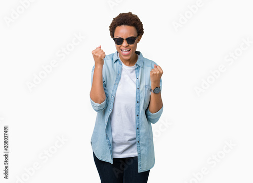 Beautiful young african american woman wearing sunglasses over isolated background very happy and excited doing winner gesture with arms raised, smiling and screaming for success. Celebration concept.