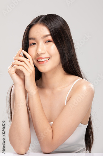 Beautiful Young Asian Woman Holding Hands smile feeling so happy and cheerful with healthy Clean and Fresh skin,isolated on white background,Beauty Cosmetics Concept