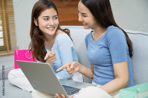 Beautiful young asian women happy couple sitting on sofa buying online using laptop a computer and phone in living room at home.