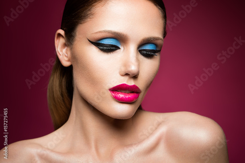 Beautiful young female face with bright fashion multicolored make-up on a pink background