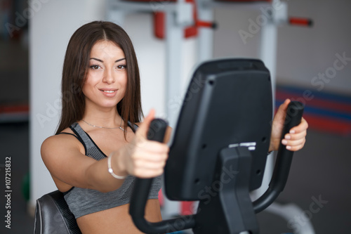 Beautiful young girl engaged in fitness in the gym. Perform cardio exercise on a simulator.