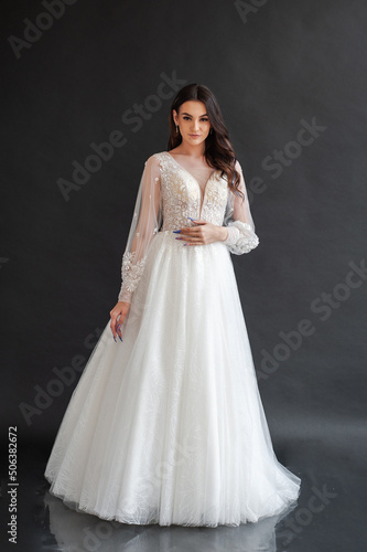 Beautiful young sexy model female bride with dark hair in gorgeous glossy long light wedding dress posing in dark studio