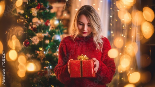 Beautiful Young Woman in Red Sweater Opening Christmas Gift with Holiday Lights