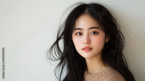Beautiful Young Woman Portrait Long Black Hair Soft Makeup Neutral Background