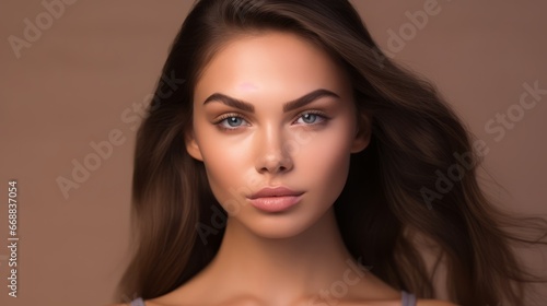 Beautiful Young Woman Portrait with Perfect Smooth Skin on Brown Background - Flawless Beauty in Focus
