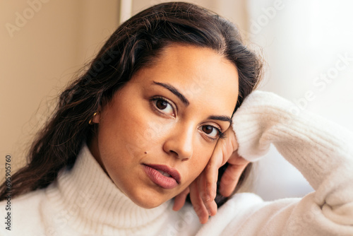 Beautiful young woman sitting on sofa near window with warm light