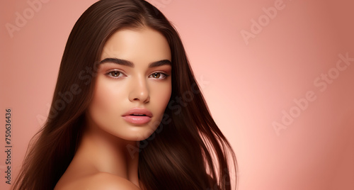 Beautiful Young Woman with Perfect Skin. Facial Skin Care. Cosmetology, Beauty, Cosmetics Concept, Spa Concept. Beige Pink Background with Copy Space.