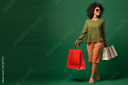 Beautiful Young Woman with Shopping Bags, Isolated on a Green Banner Background for Promotional and Advertising Use.