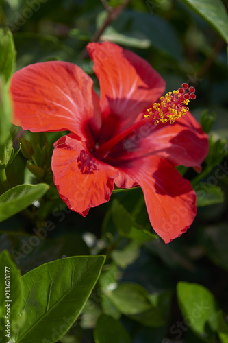 Beautifull red Ibiscus against green leaves