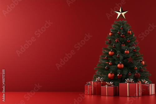 Beautifully decorated Christmas tree with lights and red ornaments against red background for traditional festive or holiday decoration concepts
