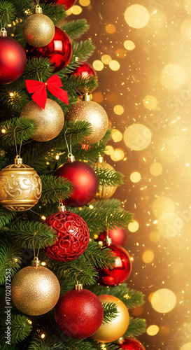 Beautifully Decorated Christmas Tree with Red and Gold Ornaments and Bokeh Lights