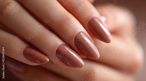 Beautifully manicured brown nails, highlighting elegant nail design, perfect for showcasing nail art trends and healthy nails, close-up of a hand with glossy finish.