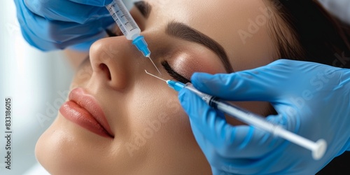Beauty Concept, a close-up photo of the face and neck, shows an attractive woman receiving hyaluronic acid treatment at a beauty salon. The patient lay on a white table with his eyes closed. She wore