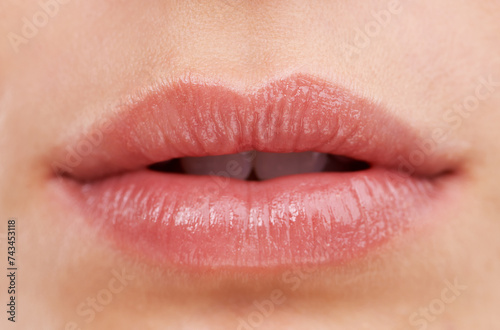 Beauty, macro and lips of woman, cosmetic and lipstick for face or makeup. Skincare, natural or close up of female person, open mouth and aesthetic with lip gloss for cosmetology or facial treatment