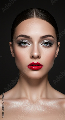 beauty makeup look, featuring a neutral tan base, shimmery eyeshadow in silver tones, and a bold red lipstick