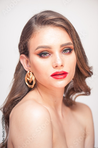 Beauty Makeup. Woman With Beautiful Face And Pink Lips. Close Up Of Beautiful Young Elegant Female Model With Glamorous Sexy Makeup, Soft Smooth Skin And Plump Full Pink Lips. High Quality Image.