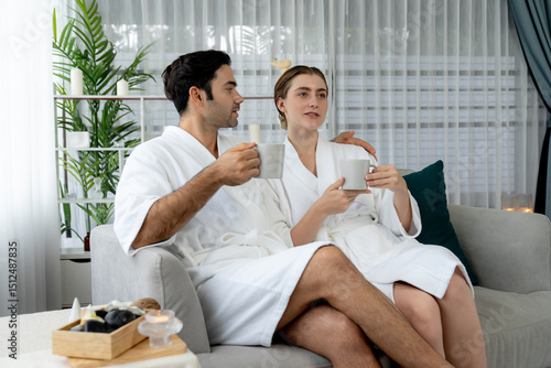 Beauty or body treatment spa salon vacation lifestyle concept with couple wearing bathrobe relaxing with drinks in luxurious hotel spa or resort room. Vacation and leisure relaxation. Quiescent