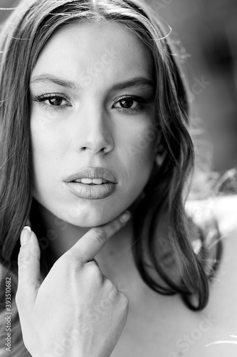 Beauty portrait of bride wearing fashion wedding dress with feathers with luxury delight make-up and hairstyle