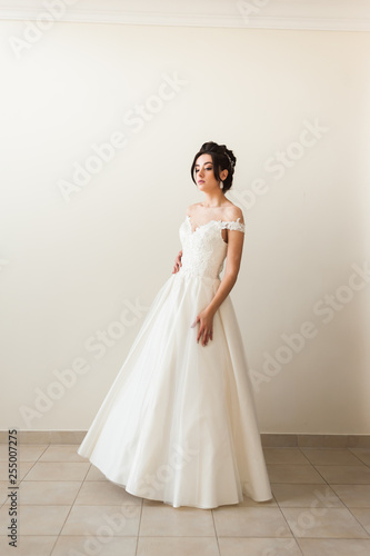 Beauty portrait of bride wearing fashion wedding dress with feathers with luxury delight make-up and hairstyle, studio indoor photo.