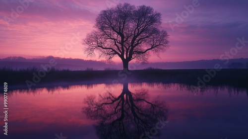 Beauty purple sunset and silhouette from tree mirroring reflection on ocean water
