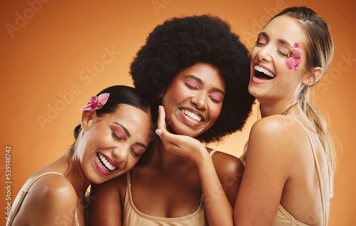 Beauty, skincare and model women in studio with flowers, makeup and cosmetics by brown background. Diversity, happiness and friends with natural self care, cosmetology and face treatment with floral.