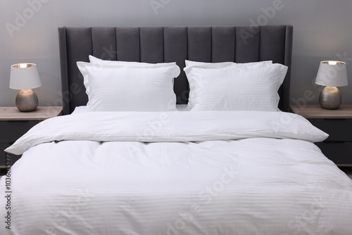 Bed with clean linens and pillows indoors