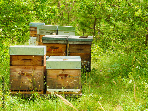 Bee hives in green forest. Beekeeping.