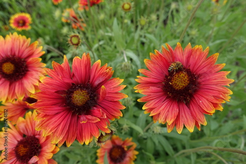 Bee pollinating red and yellow flowers of Gaillardia aristata in June