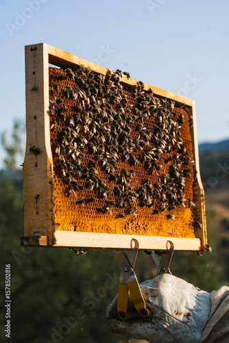 Beekeeper holding honeycomb frame covered with bees in apiary