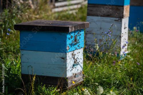 Bees crawling at the entrance to the hive, bee family. Bees flying around the beehives in the apiary.