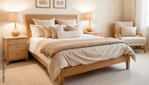 Beige and Cream Bedroom Interior with Wooden Bed and Chair