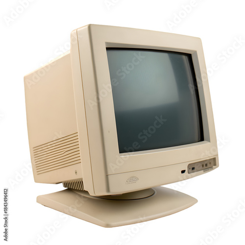 Beige CRT monitor with black screen on transparent background
