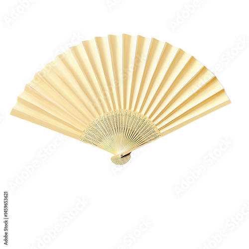 Beige hand fan radiating delicate pleats against stark backdrop, art object
