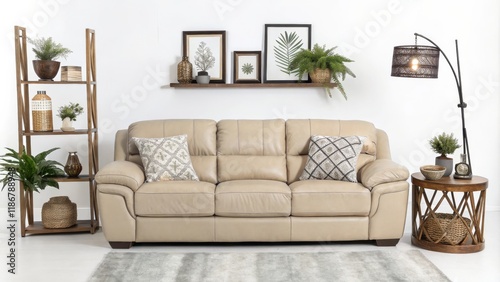 Beige Leather Sofa in Modern Living Room with Plants and Wooden Accents, Interior Design, Home Decor Living room, sofa, plants