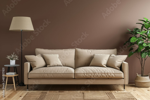 beige sofa against a brown wall in a living room interior. scandinavian home interior design of modern living room