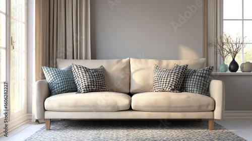 Beige sofa with pillows against the wall in a living room interior.