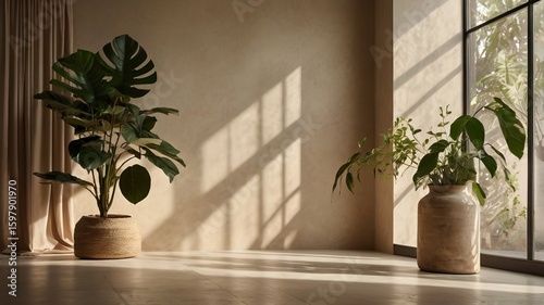 Beige Studio Background with Natural Plant Window Shadows - 19