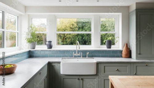 Belfast sink in a modern, light-filled shaker-style kitchen