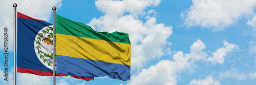 Belize and Gabon flag waving in the wind against white cloudy blue sky together. Diplomacy concept, international relations.